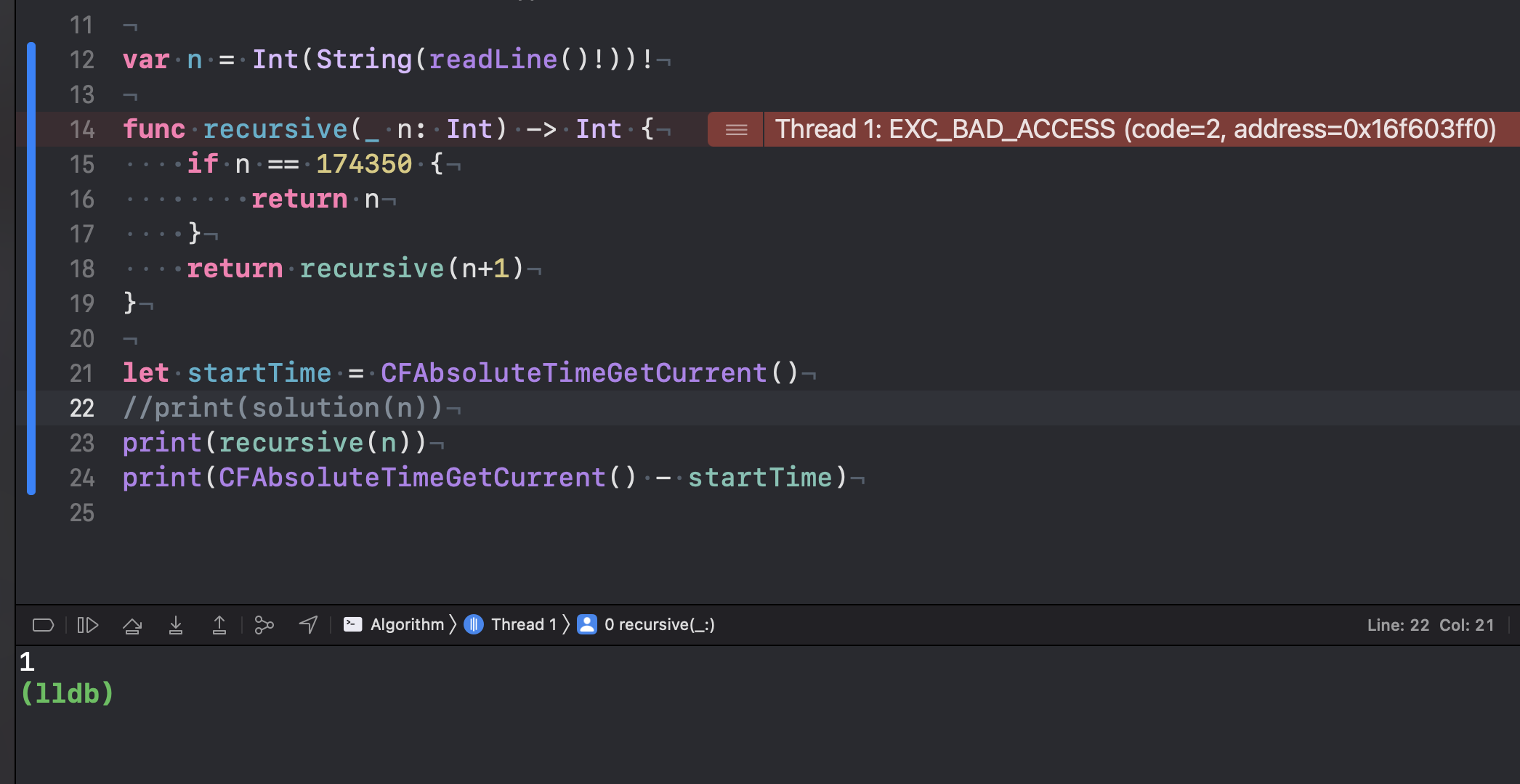 - 하지만 swift에서는 재귀함수를 호출할 수 있는 횟수가 제한되어 있다.
