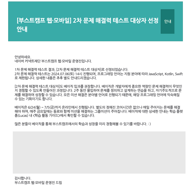 베이직 과정에 참여하지 않은 사람들은 베이직 과정 연계(?)된 문제를 순수 실력으로 봐야만 했다. 2차 테스트 시험 대상자와 베이직 입과자 모두에게 권장되는 교육과정이었고, 모두에게 기회가 부여되어있었기에 꽤 많은 사람들이 참여했어서 따로 불만 사항은 없는 듯 하다.