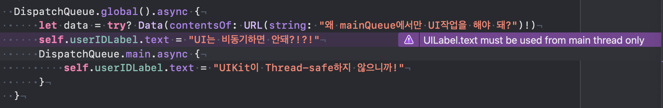 UI를 다루는 UIKit이 Thread-safe하지 않다는 것은, 비동기 처리가 불가능하다는 것을 말한다. 왜냐, atomic(독립성)을 갖추지 않기 때문에.