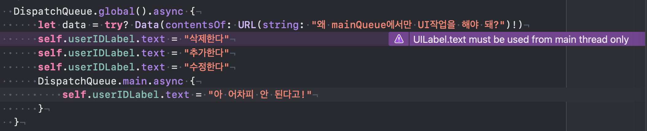 또한 Thread-safe하다는 것은 UI를 비동기적으로 처리할 수 있다는 말이 되고, 이는 당연하게도 Thread-safe하지 않은 UIKit에서 UI를 비동기 처리하려하면 에러를 발생시킨다.