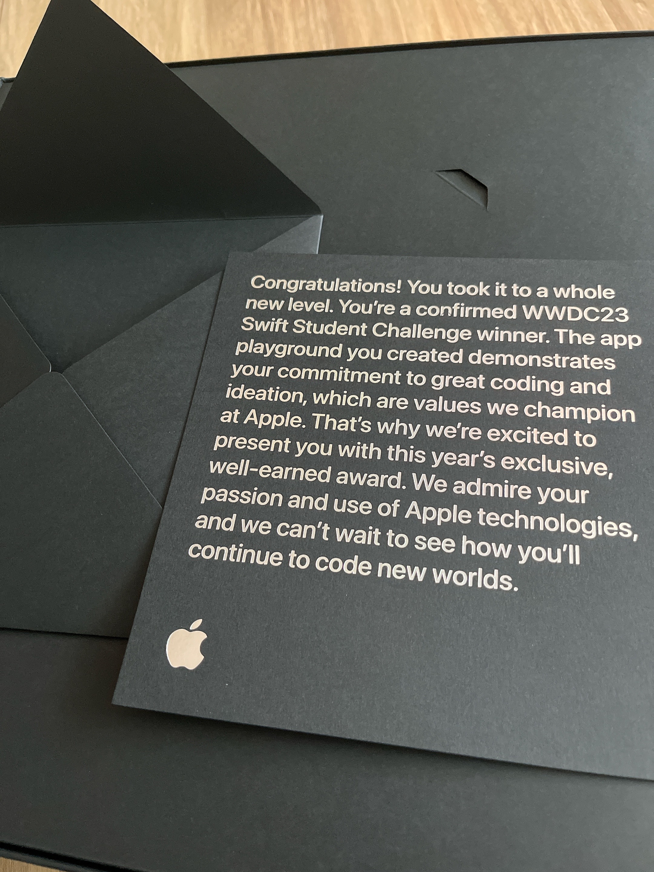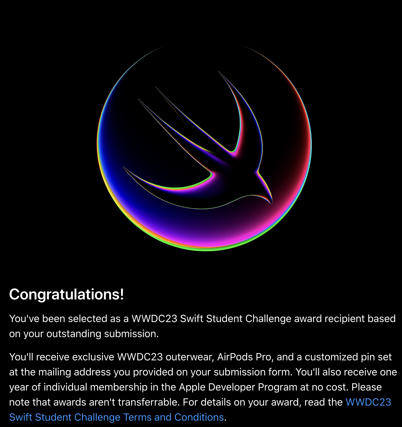 - WWDC23 Swift Student Challege(SSC) 수상 대상자에 선정되었다. SSC는 애플에서 전세계 iOS 학생 개발자를 대상으로 진행하는 것으로, 최대 350명의 수상자가 나올 수 있으며, 전년도에는 140명의 수상자가 나온 것으로 알고 있다.