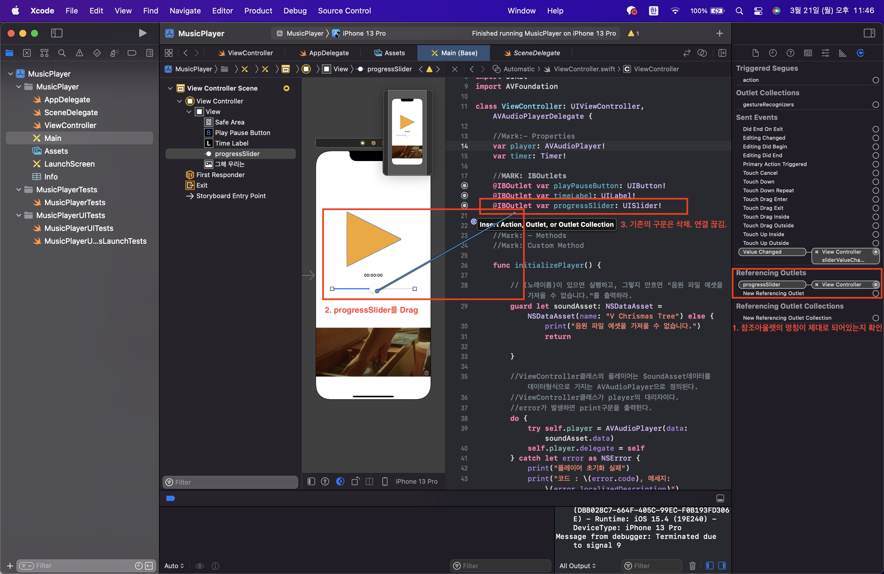 조금 뒤에 찾은 Main.storyboard의 View controller에 있는 잘못된 명칭으로 설정한 progressSliger.도 progressSlider로 수정했다.