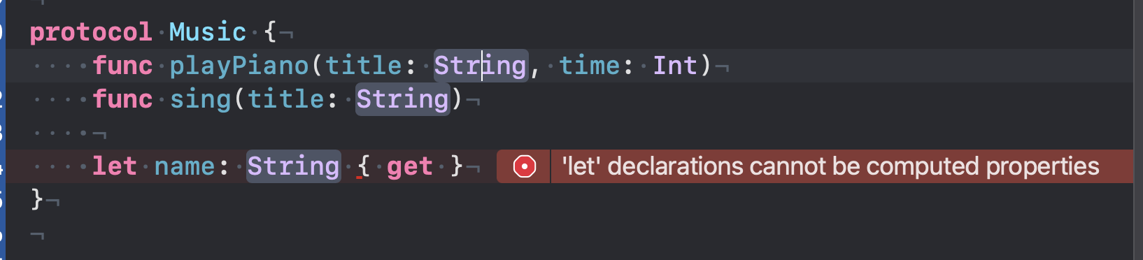 예제를 보면, 프로토콜은 초기화하지 않은 변수와 실행구문이 없는 함수를 선언하고, 상수 let을 사용하지 않는다.