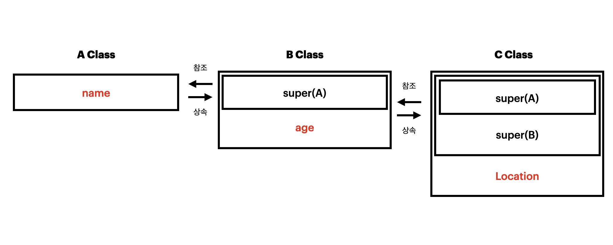 - 따라서 여러 클래스의 속성과 메서드를 상속받기 위해서는 클래스 상속 계층이 쌓거나, 구조를 잘 설계해야 한다.