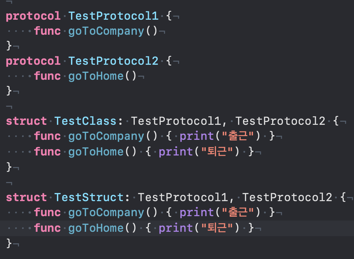 - 왼쪽 Class와 오른쪽 Struct 예시 모두 TestProtocol을 채택하고 있는데, 출력이 다르다.