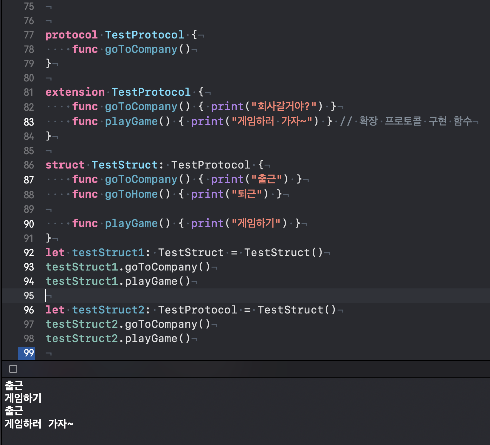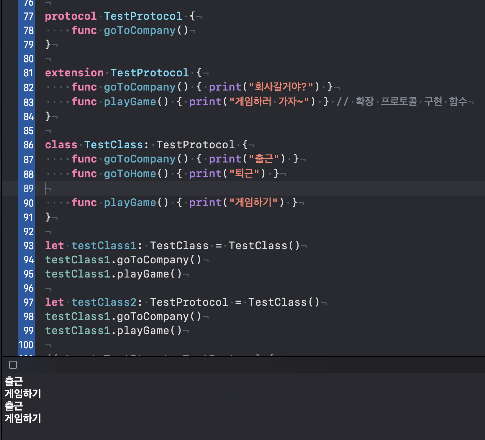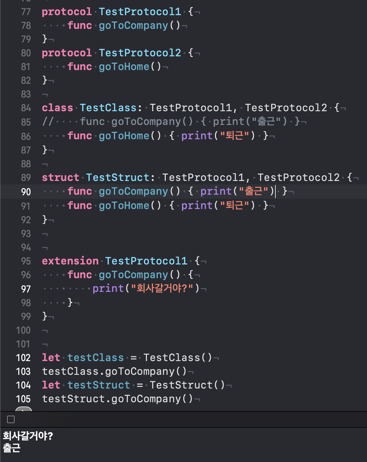 - extension으로 구현한 TestProtocol1을 채택한 두 인스턴스(testClass, testStruct)가 실행될 때,