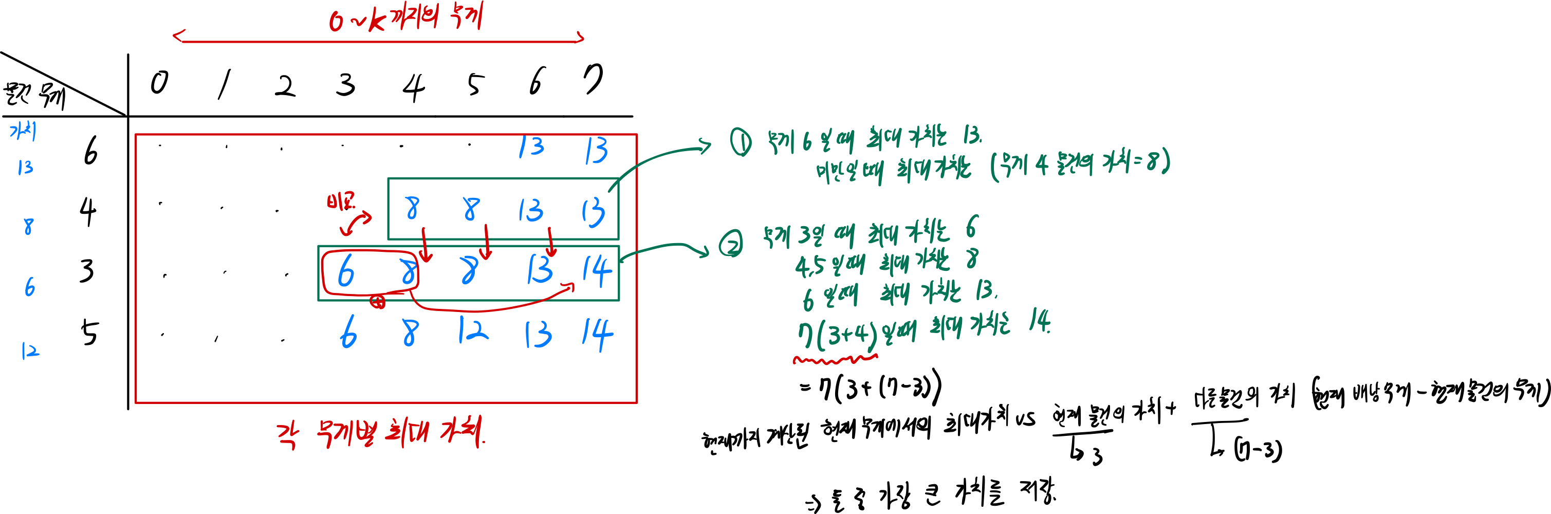 [만약 현재 기준무게(j)가 5라면, (무게 j-3의 가치) + (무게 3의 가치)를 기존에 기록된 최대가치인 8과 비교해야 한다. -> 단순히 최대무게(k)와의 비교가 아니라는 의미.]